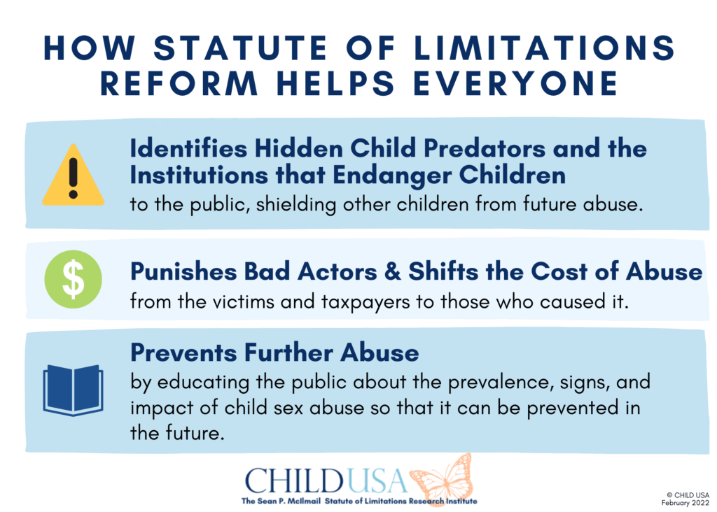 At CHILD USA, we fight for the rights of children to be free from child sex abuse (“CSA”) through legal reforms that hold individuals and institutions accountable. One way we do this is by leading the national and global statute of limitations (“SOL”) reform movement to (1) eliminate civil and criminal SOLs for child sex abuse crimes, and (2) to revive civil child sex abuse claims that were unfairly blocked by short SOLs. SOL reform is CHILD USA’s signature systemic solution to the preventable child sexual abuse epidemic.